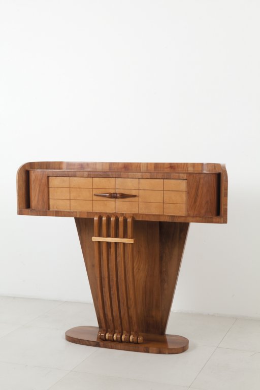UNA CONSOLE, anni '40Legno impiallacciato in noce e acero. Cm 98 (h) x 116 x 30.