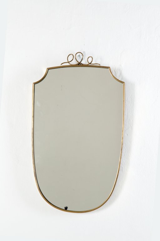 UNO SPECCHIO DA PARETE, anni '50. Ottone, cristallo argentato. Cm 66 x 40.
