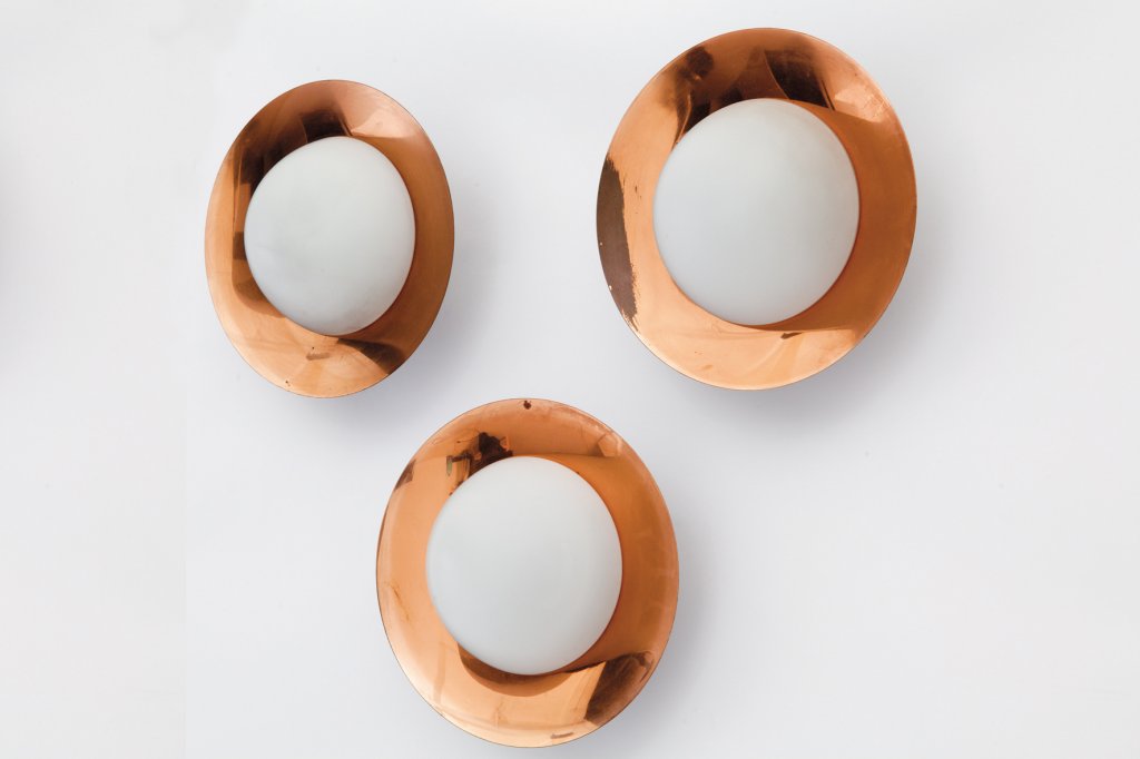 Lotto 1188 | TRE LAMPADE A PARETE, anni '50. Rame, vetro opalino satinato. Diametro cm 20,...