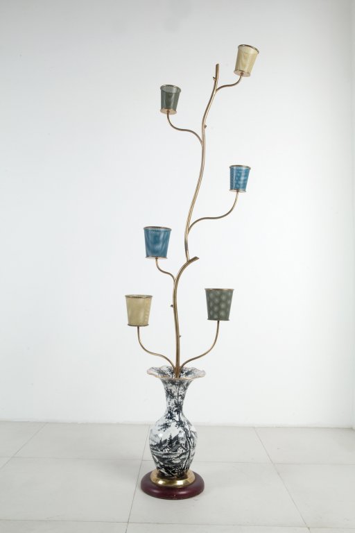 UNA FIORIERA A PIANTANA, anni '50. Ceramica decorata, ottone, lamierino...