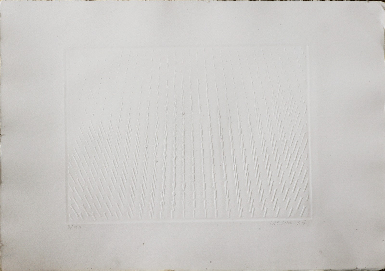 Tiratura: 8/30. L'opera faceva parte di un'edizione, comprendente ventuno esemplari firmati dagli artisti Lucio Fontana, Heinz Mack, Gunter Ueker e Nanda Vigo, curata Mario Arcaini, Edizioni La Quercia, Milano 1966. Dimensioni disegno: Cm 23x31. numerato, firmato e datato in basso a matita.
