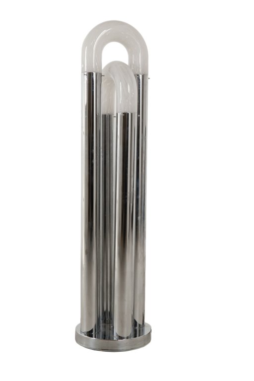 MAZZEGA UNA LAMPADA DA TERRA, anni '70. Acciaio cromato, vetro soffiato....