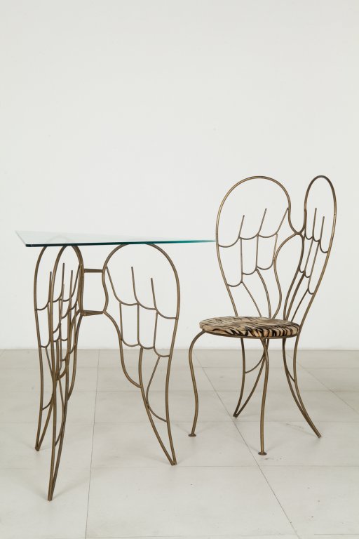 Ferro forgiato verniciato, cristallo, sedile imbottito rivestito in tessuto.