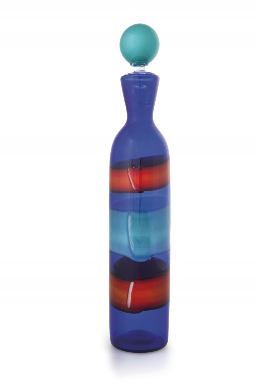 FULVIO BIANCONI Una bottiglia in vetro soffiato a fasce, produzione VENINI,...