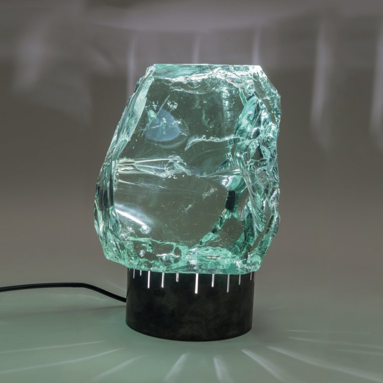 Ottone nichelato spazzolato, cristallo scalpellato.