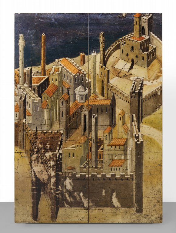 Con due ante in legno rivestito con riproduzione fotolitografica di un affresco rappresentante un paesaggio urbano del XIV secolo, verniciato al poliestere.