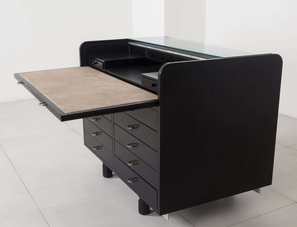 l"estrazione del piano di lavoro, rivestito in pelle.
