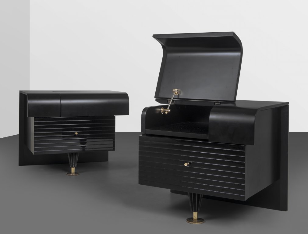 PIERRE CARDIN Due comodini, anni '70. Ottone, ghisa, legno laccato. Marca...