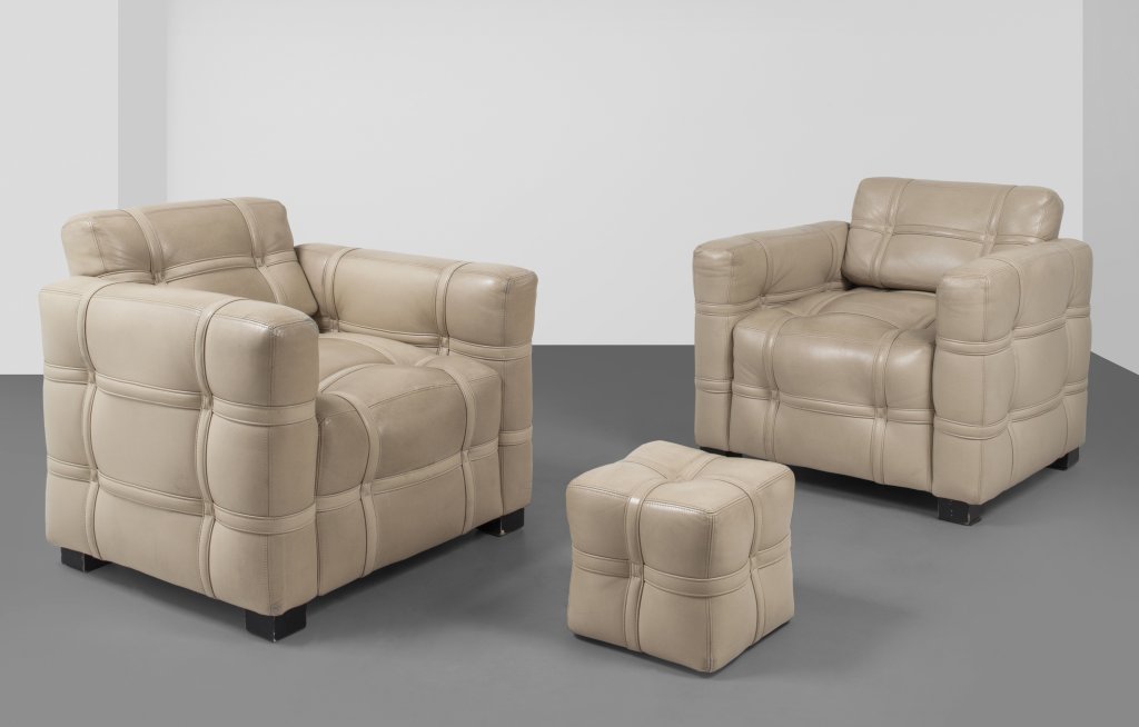 SALVATORE FERRAGAMODue poltrone e un poggiapiedi, anni '70. Struttura in...