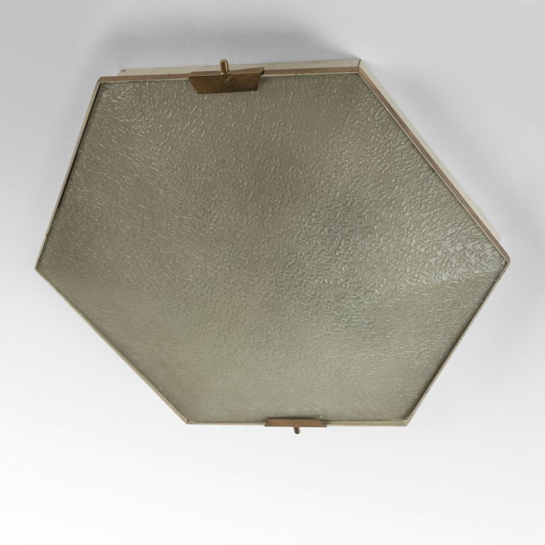 Lamierino verniciato, ottone, vetro ghiacciato inciso.