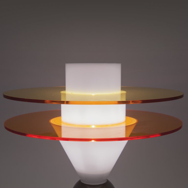 Enamelled aluminum, frosted opaline glass, and perspex,