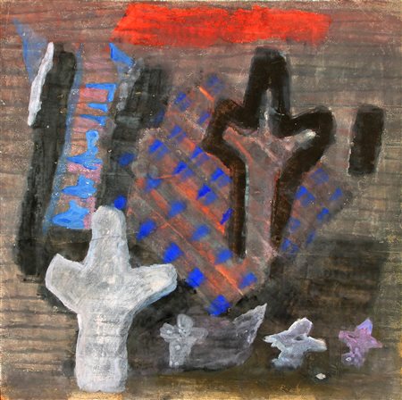 Riccardo LICATA Torino 1929 Venezia, 2014 Composizione, 1959, pittura su cartoncino, cm. 79 x 78, Timbro della Galleria Roggia grande, Trento (al retro) Autentica dell'Archivio delle opere di Licata, galleria Dante Vecchiato, con n. D1004-0750, autenticata dall'artista