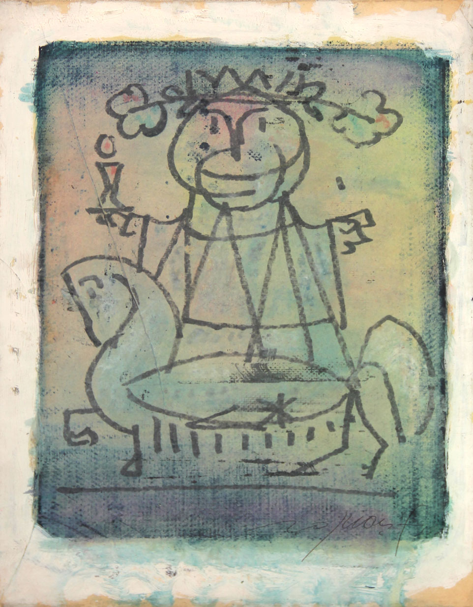 Franco ROGNONI Milano 1913 Milano 1999 Bacco a cavallo, anni 60, acquarello e tecnica mista su carta applicata su tela, cm. 50 x 35, Firma 'Rognoni F' (in basso a destra) #Timbro della Galleria Ferrari, Treviglio (al retro) Autentica a cura della moglie Mariuccia Rognoni Noè