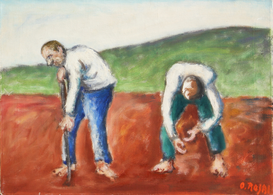 Ottone ROSAI Firenze 1895 Ivrea 1957 Seminatori, anni 50, olio su tela, cm. 50 x 70, Firma 'O. Rosai' (in basso a destra) #Etichetta e timbro della galleria Sant'Erasmo, Milano; #etichetta e timbro della Raccolta Giraldi, Livorno-Firenze (al retro) Autentica a cura di Luigi Cavallo