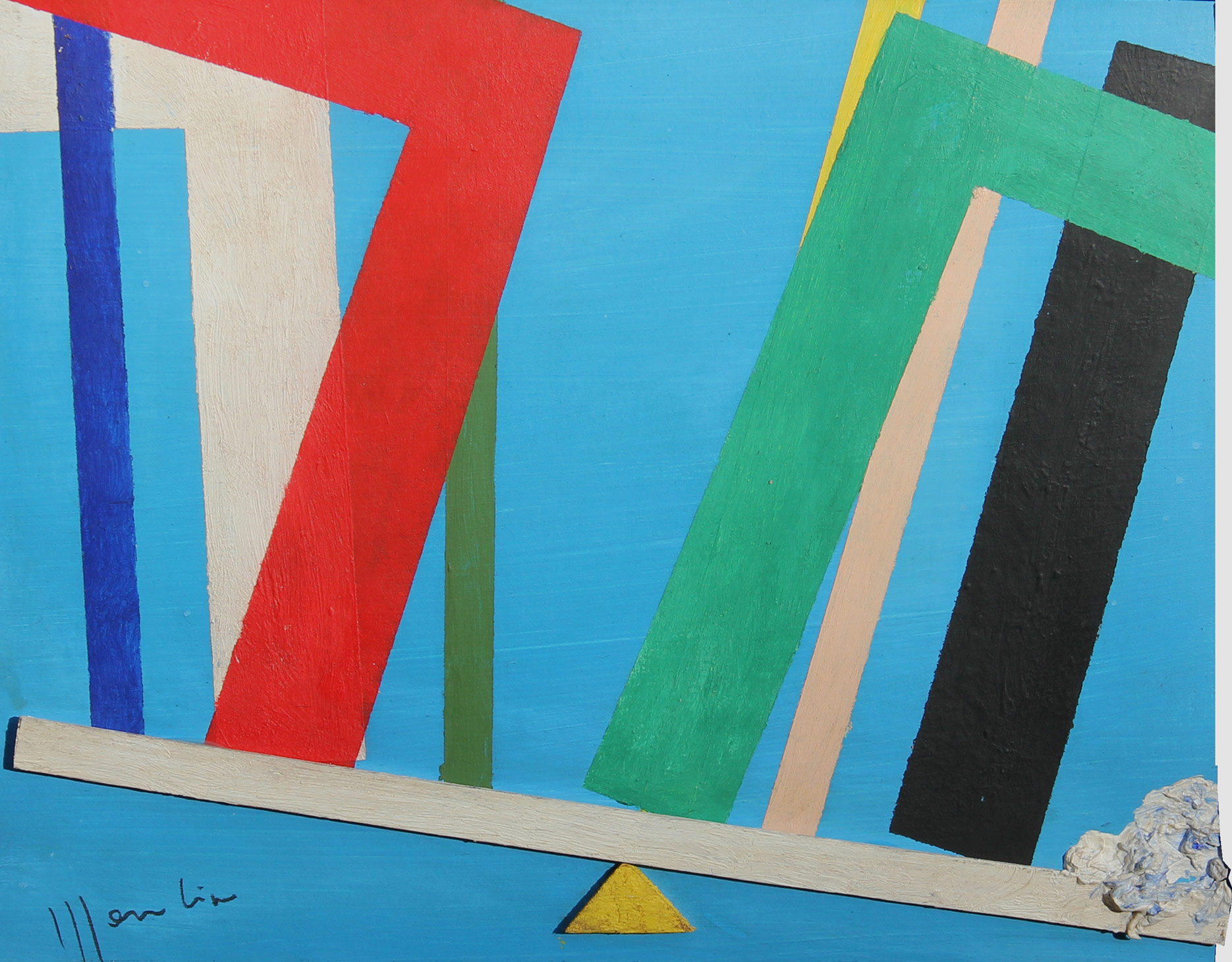 Aldo MONDINO Torino 1938 Torino 2005 Le bilance, olio e tecnica mista su cartone, cm. 29 x 35, Firma 'Mondino' (in basso a sinistra) #Etichetta e timbro della galleria Il Punto, Torino; #etichetta di Artissima 1994, Torino (al retro)