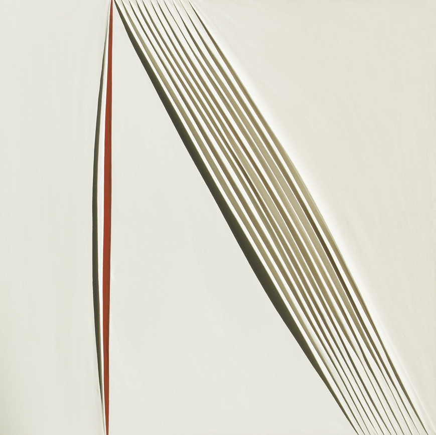 Nando STEVOLI Ferrara Pleating N. 21, 2016, tempera e calce su tela estroflessa applicata su tavola, cm. 98 x 98, Titolo, tecnica, misure, firma, data 'Pleating N. 21, tempera e calce su tela, 98x98, Nando Stevoli, 2016'; #etichetta dell'artista (al retro)