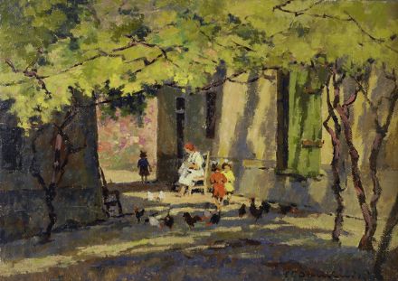 Carlo Domenici (Livorno, 1898 - 1981) SOTTO IL PERGOLATO Olio su cartone, cm. 50x70 Firma in basso a detsra.