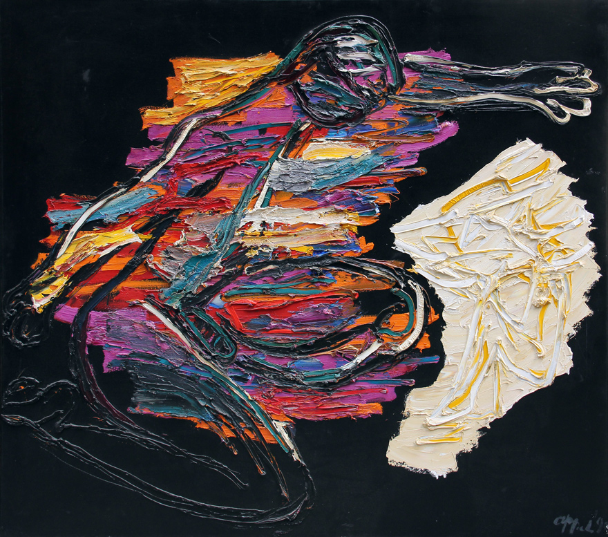 Karel APPEL Amsterdam 1921 Zurigo 2006 Amour Imaginaire, 1990, olio su tela, cm. 160 x 180, S. Seghi, 'Mostra collettiva N. 2164 Novembre 2010', Galleria Roberto Rotta Farinelli, Genova, Firma, data 'Appel, 90' (in basso a destra) #Scritte, firma, titolo, data, misure, tecnica, collezione 'Reg. X90035 Cat. Gen., Karel Appel, Amour imaginaire, 1990, 160x180, olio su tela, Collez. Rinaldo Rotta, Genova' (al retro) Provenienza della Galleria Roberto Rotta Farinelli, Genova