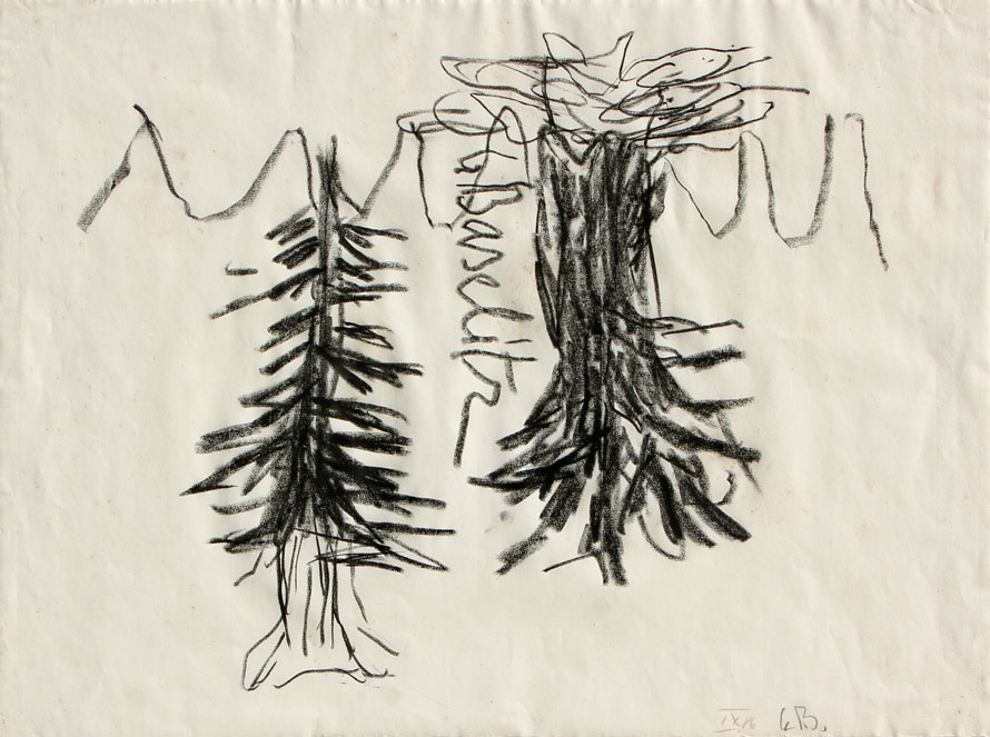 Georg BASELITZ Kamenz,1938 Senza titolo, 1986, carboncino su carta applicata su cartoncino, cm. 48.3 x 63.3, S.Fontana 'Da Grosz a Kiefer - percorsi nell'arte tedesca', Lattuada Studio, Milano, 2006, p.13, Firma 'G. Baselitz' (al centro); #data, sigla 'IX86, G.B.' (in basso a destra) #Etichetta della galleria Michael Werner, Colonia; #etichetta e timbro dello Studio Lattuada, Milano (al retro) Certificato di provenienza della galleria Michael Werner, Colonia su fotografia #Opera registrata al n. di archivio GBZ 2197