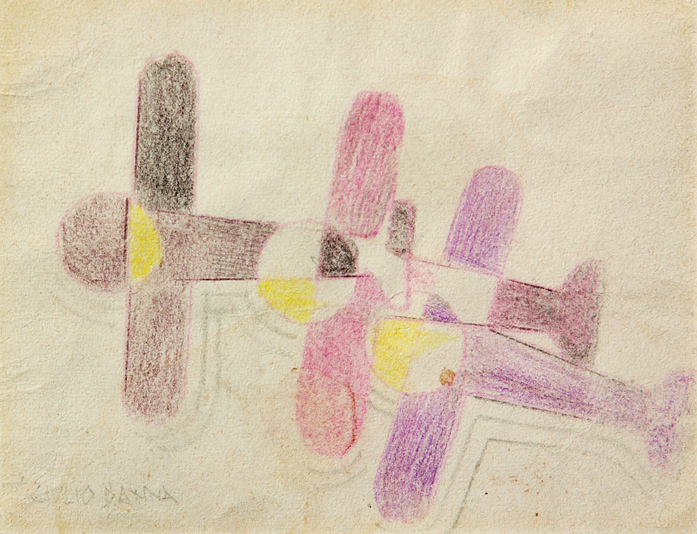 Giulio D'ANNA Villarosa 1908 Messina 1978 Stormo aereo, 1932, pastelli su carta assorbente, cm. 15 x 19.3, Firma 'Giulio D'Anna' (in basso a sinistra) Autentica dell'Archivio Storico Dei Futuristi Siciliani curato da Diomeda Arte, Palermo