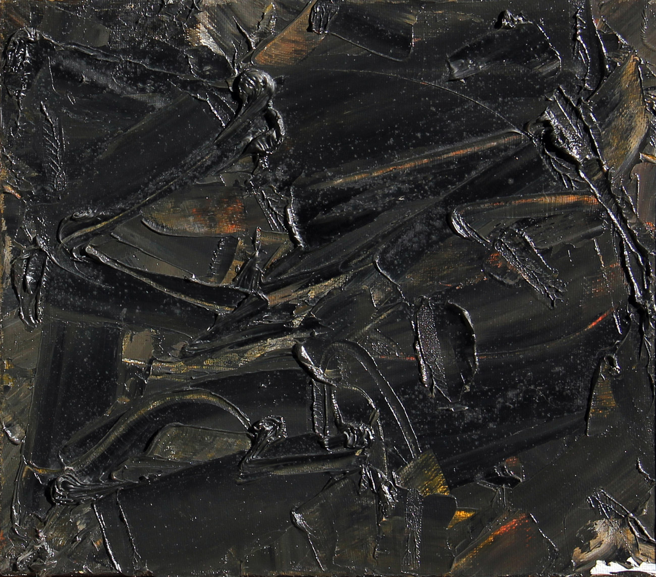 Piero RUGGERI Torino 1930 Torino 2009 Visione in nero, anni 2000, olio su tela, cm. 30 x 35, Firma, tecnica, misure, titolo 'Ruggeri, olio su tela, 30x35, Visione in nero' (al retro) Autentica dell'artista su fotografia