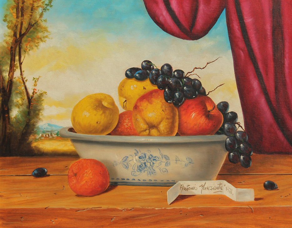 Antonio NUNZIANTE Napoli, 1956 Composizione, 1978, olio su tela, cm. 40 x 50, Firma, data 'Antonio Nunziante, 1978' (in basso a destra) #Firma, data 'Da me dipinto, Antonio Nunziante, 78'; #certificato di garanzia dell'artista (al retro) Autentica dell'Archivio Antonio Nunziante, con n. AN1978-1002B