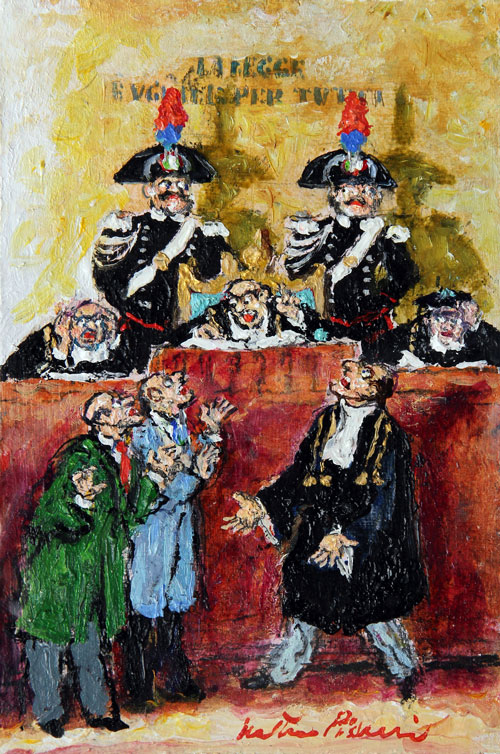 Walter PIACESI Ascoli Piceno 1929 Gli imputati, 2014, olio su tavola, cm. 30 x 20, Firma 'Walter Piacesi' (in basso a destra) #Data, firma, titolo, tecnica, misure, numerazione '2014, Walter Piacesi, Gli imputati, olio su tavola, cm 30x20' (al retro) Autentica dell'artista su fotografia, con etichetta dello Studio D'Arte Edizioni Cà Spinello, Fermignano, con n. BKHHX/03126