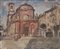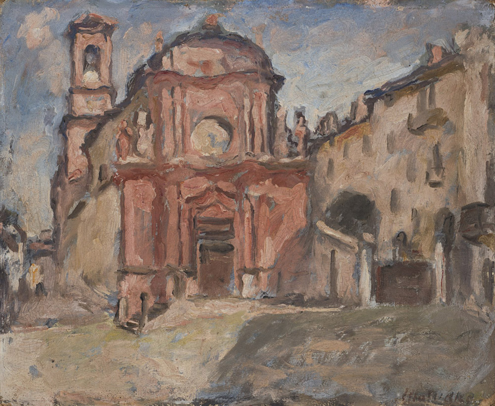Ugo Malvano (Torino 1878 - Finale Ligure 1952) "Chiesa Croce Nera. Saluzzo" olio su cartone pressato (cm 37x46) Firmato in basso a destra Al retro: cartiglio con titolo