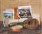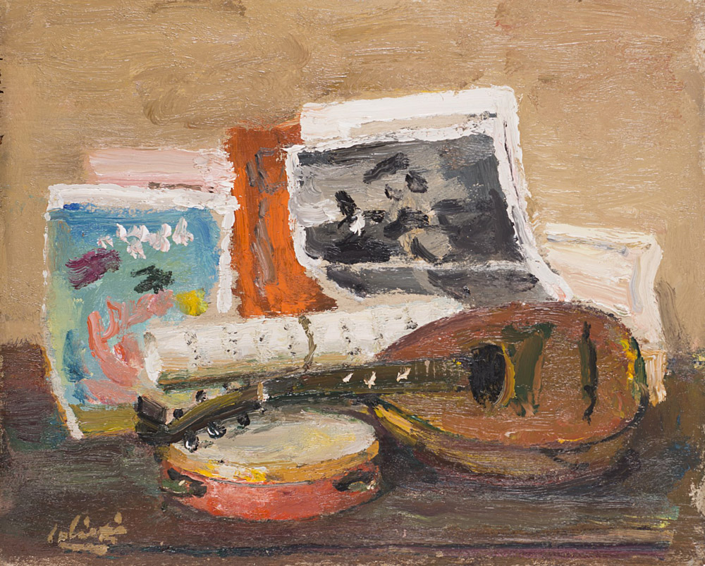Alberto Salietti (Ravenna 1892 - Chiavari 1961) "Composizione con mandolino, tamburello e riviste" olio su compensato (cm 21.7x26.7) Firmato in basso a sinistra Al retro: cartiglio e timbro Esposizione: 1967 "Mostra Personale di Alberto Salietti" Galleria Gian Ferrari, Milano. Cartiglio e timbro al retro In cornice