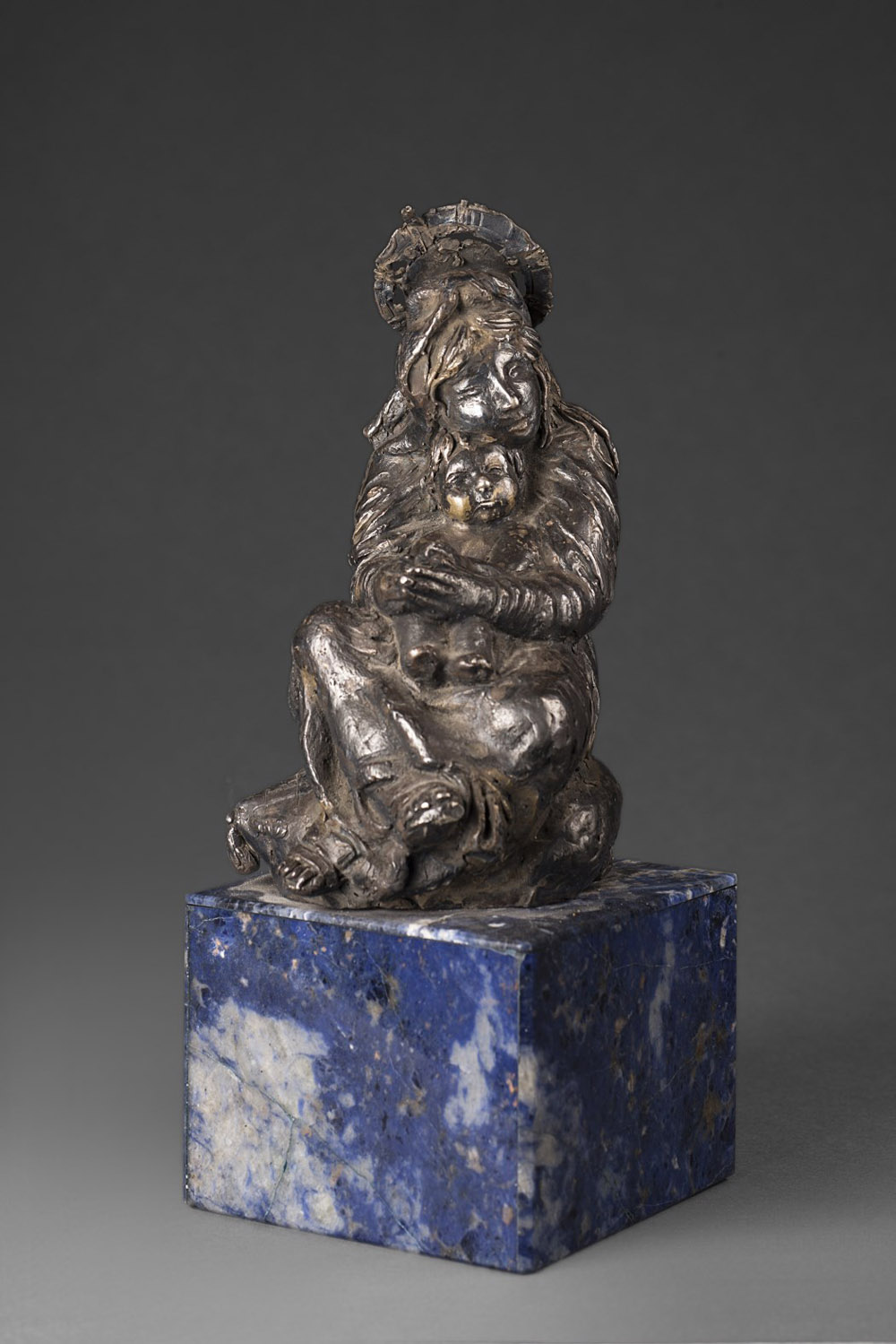 Mario Ceconi di Montececon (Trieste 1893 - Milano 1980) (Attribuito) "Madonna con Bambino" scultura in argento (h cm 18) poggiante su base in lapislazzulo Tracce di firma sul lato