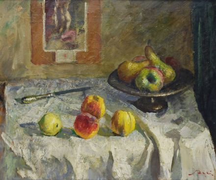 Giulio Salti (Barberino di Mugello, 1899 - Firenze, 1987) NATURA MORTA Olio su faesite, cm. 50x60 Firma in basso a destra e sul verso.