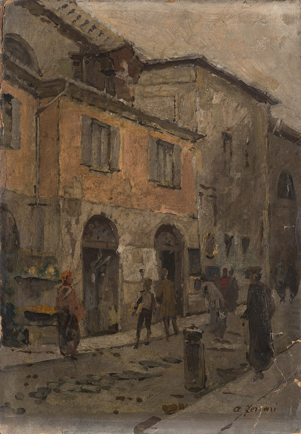 Arturo Ferrari (Milano 1861 - 1932) "Il Vicolo di San Bernardino" olio su cartoncino (cm 35x24.5) Firmato in basso a destra Bibliografia: E.Sioli Legnani "Poesia di Milano" Milano 1940, opera citata e riprodotta in bianco e nero a pag.102, tav.43 (Difetti)