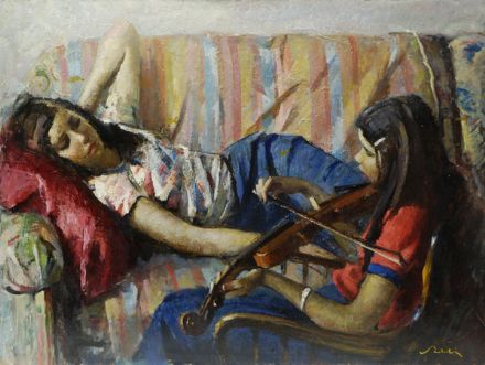 Giulio Salti (Barberino di Mugello, 1899 - Firenze, 1987) LE AMICHE Olio su faesite, cm. 60x80 Firma in basso a destra. Sul verso: firma e titolo.