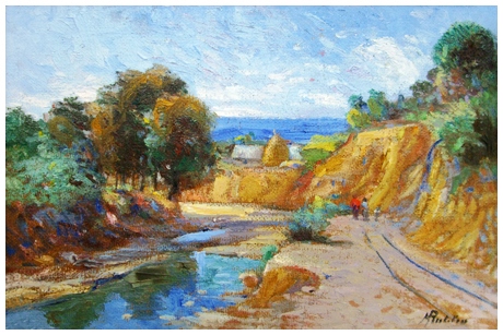 RUTILIO MUTI Vicchio di Mugello 1904 – Vicchio di Mugello 1995 Lungo la Chioma (torrente Chioma) Olio su faesite 25,5 x 37. Firma in b. a d.; sul verso titolo + scritta dell’artista. B.A.: 150