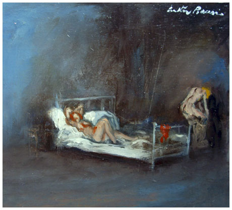 WALTER PIACESI Ascoli Piceno 1929 Interno con figure 1978 Olio su cartone 20,5 x 22,5. Firma in a. a d.; sul verso data, firme, titolo, tecnica e misure + timbro, firma e numero arch. Studio d’Arte Ca’Spinello, Fermignano. B.A.: 500