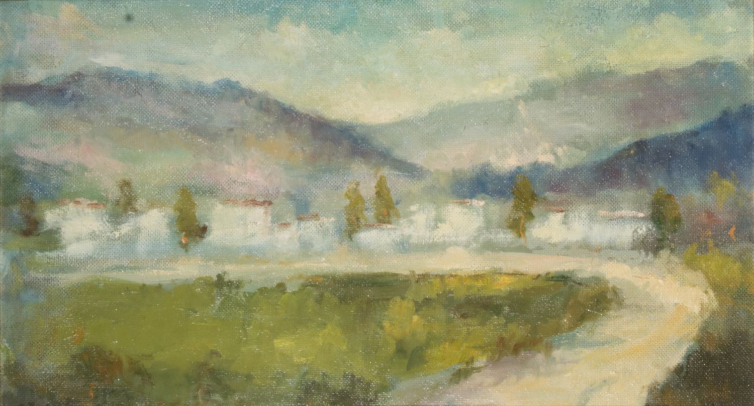 Giovanni Zanetti (1910-1983) Paesaggio firma in basso a sinistra; titolo, data e firma sul retro olio su masonite cm 35x64