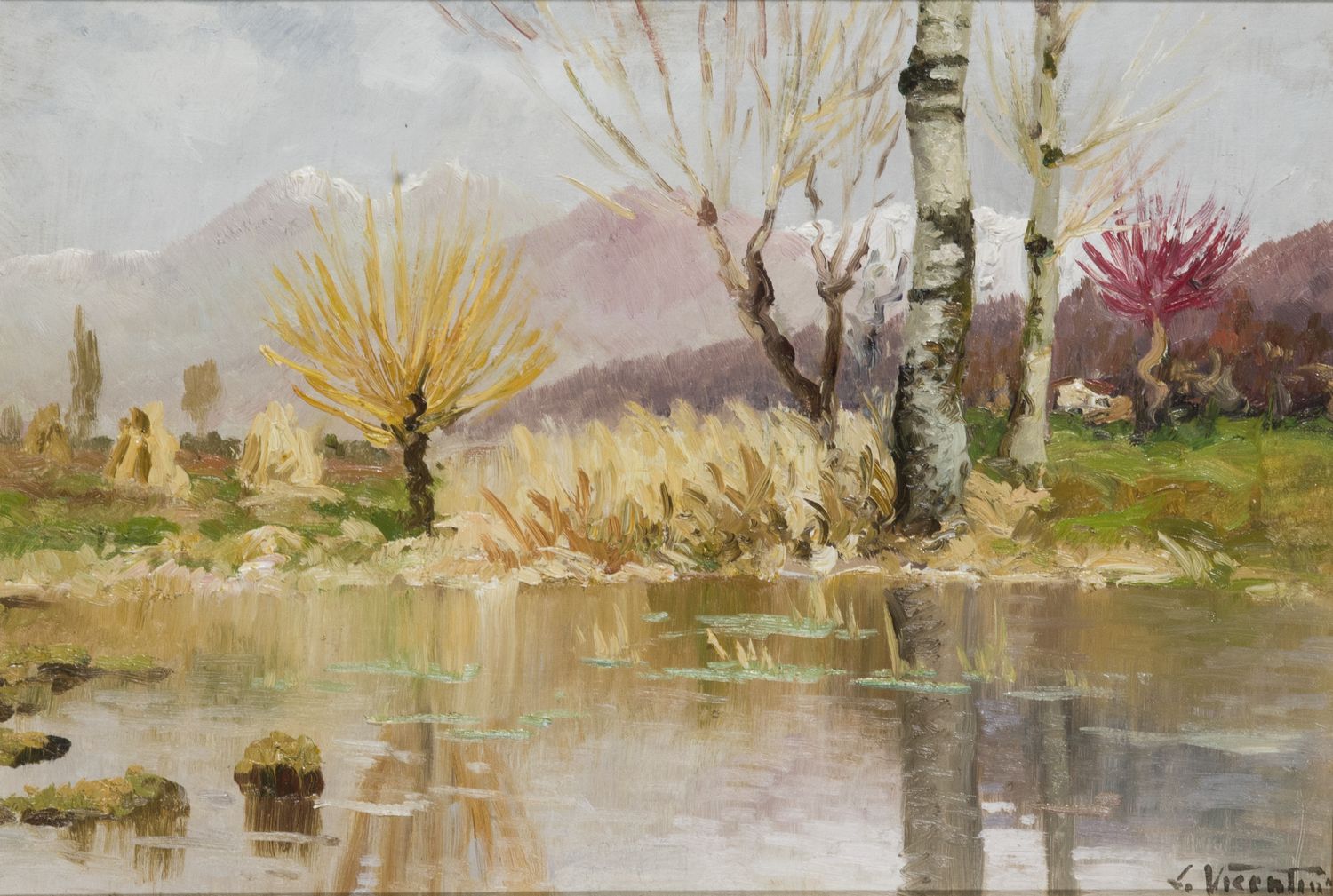 Luigi Vicentini (1901-1970) Paesaggio lacustre firma in basso a destra olio su tavola cm 27x40
