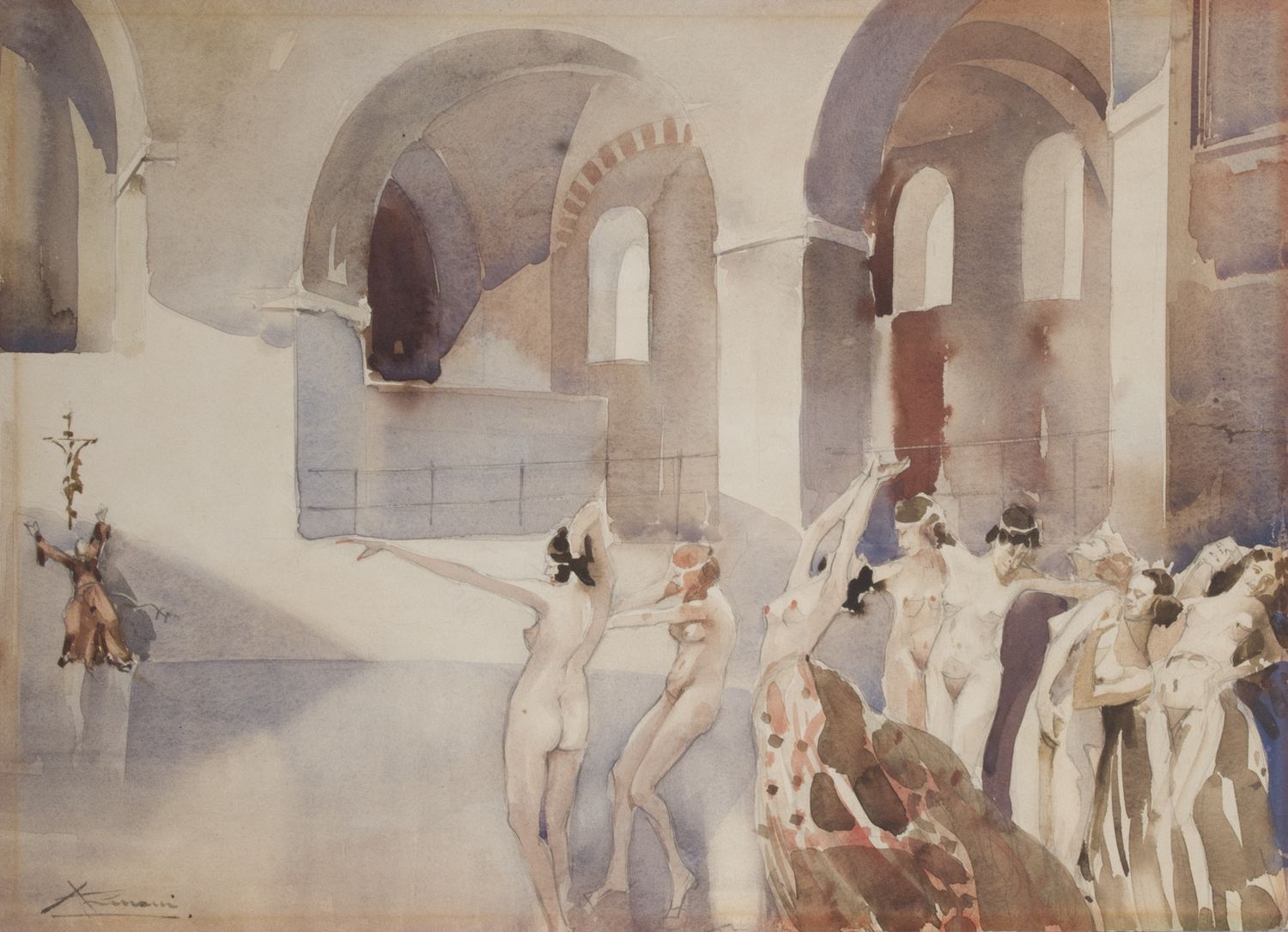 Ernesto Giuliano Armani (1898-1986) Le tentazioni di S. Antonio - Ambiente: la Rotonda di Brescia firmato in basso a sinistra; data, titolo e firma autografa sul retro acquerello su carta applicata su cartone cm 36,5x50 eseguito nel 1927