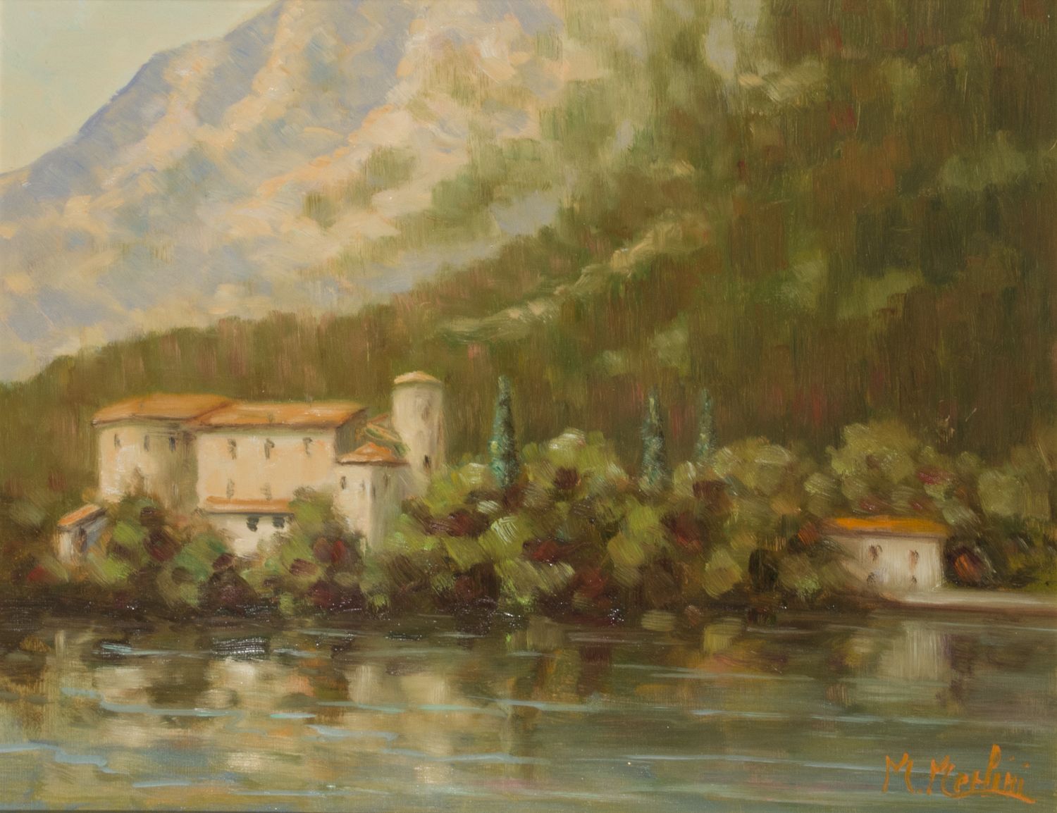 Mario Merlini (secolo XX) Paesaggio lacustre firma in basso a destra olio su...