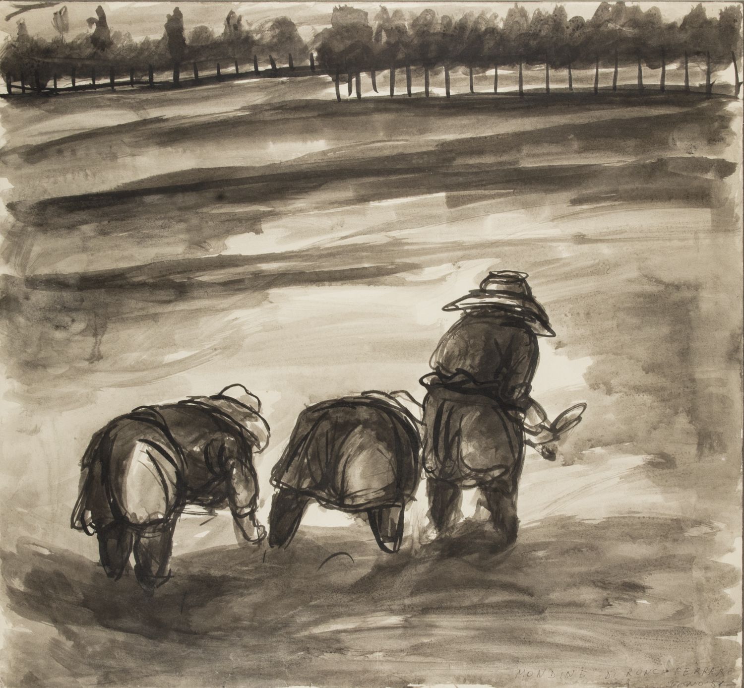 Tono Zancanaro (1906-1985) Mondine di Roncoferraro titolo, firma e data in basso a destra china su carta cm 47,5x51,5 eseguito nel 1951