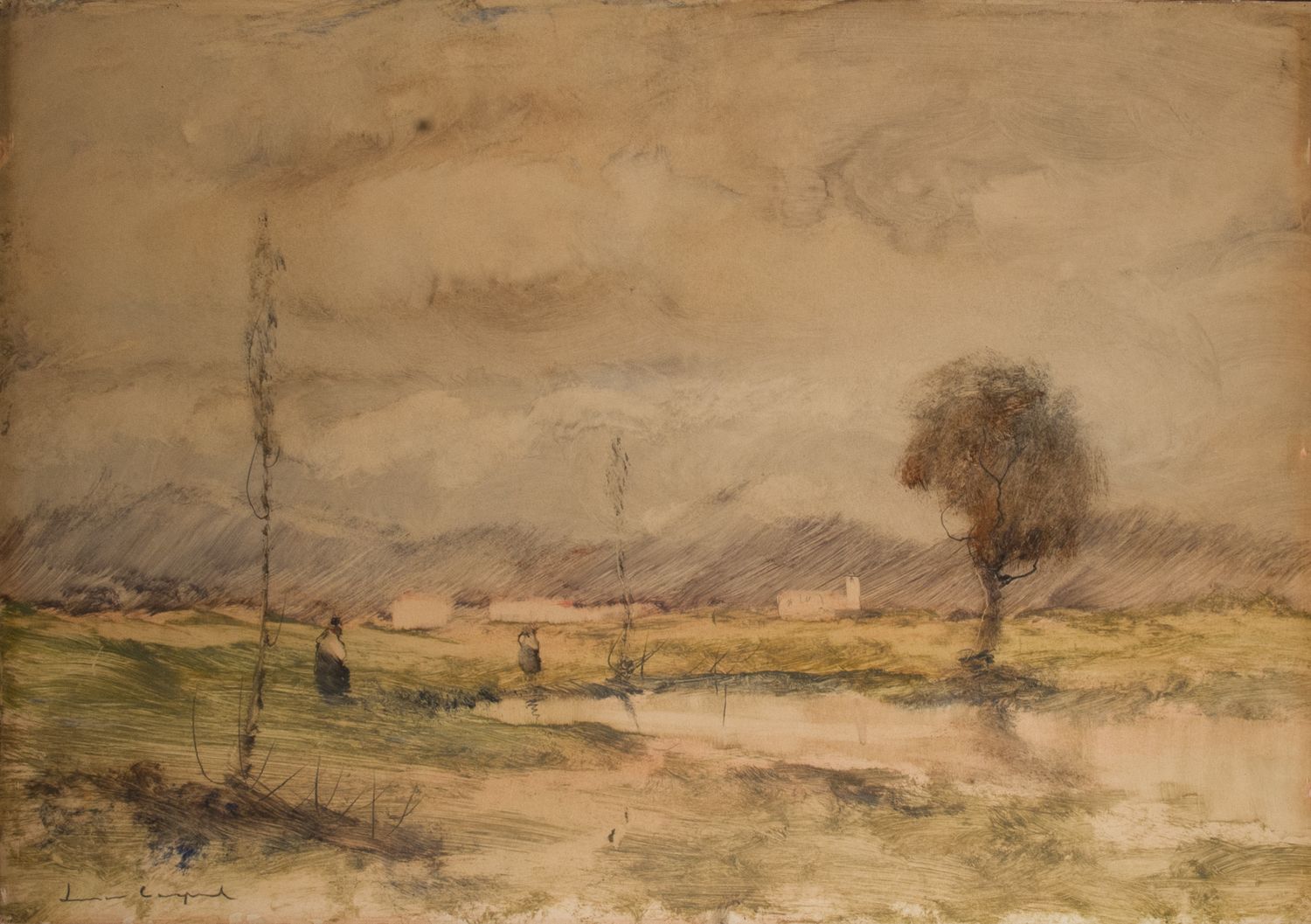 Lucio Cargnel (1903-1998) Paesaggio lacustre firma in basso a sinistra tecnica mista su carta cm 49,7x70,3