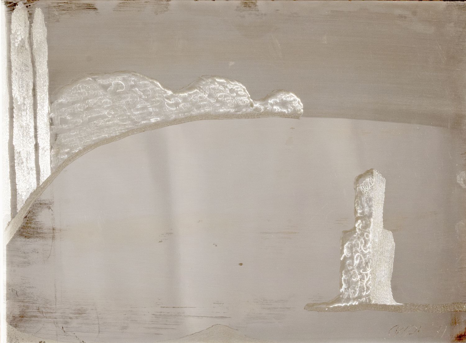 Virgilio Guidi (1891-1984) Circolare Venezia firma e data in basso a destra; numerato 72/100 incisione su lastra d’argento; sul retro etichetta con autentica autografa dell’artista cm 40x30 eseguito nel 1971 g 500 Provenienza: Galleria alla Chiave, Venezia Bottega d’Arte Pancheri, Rovereto