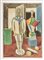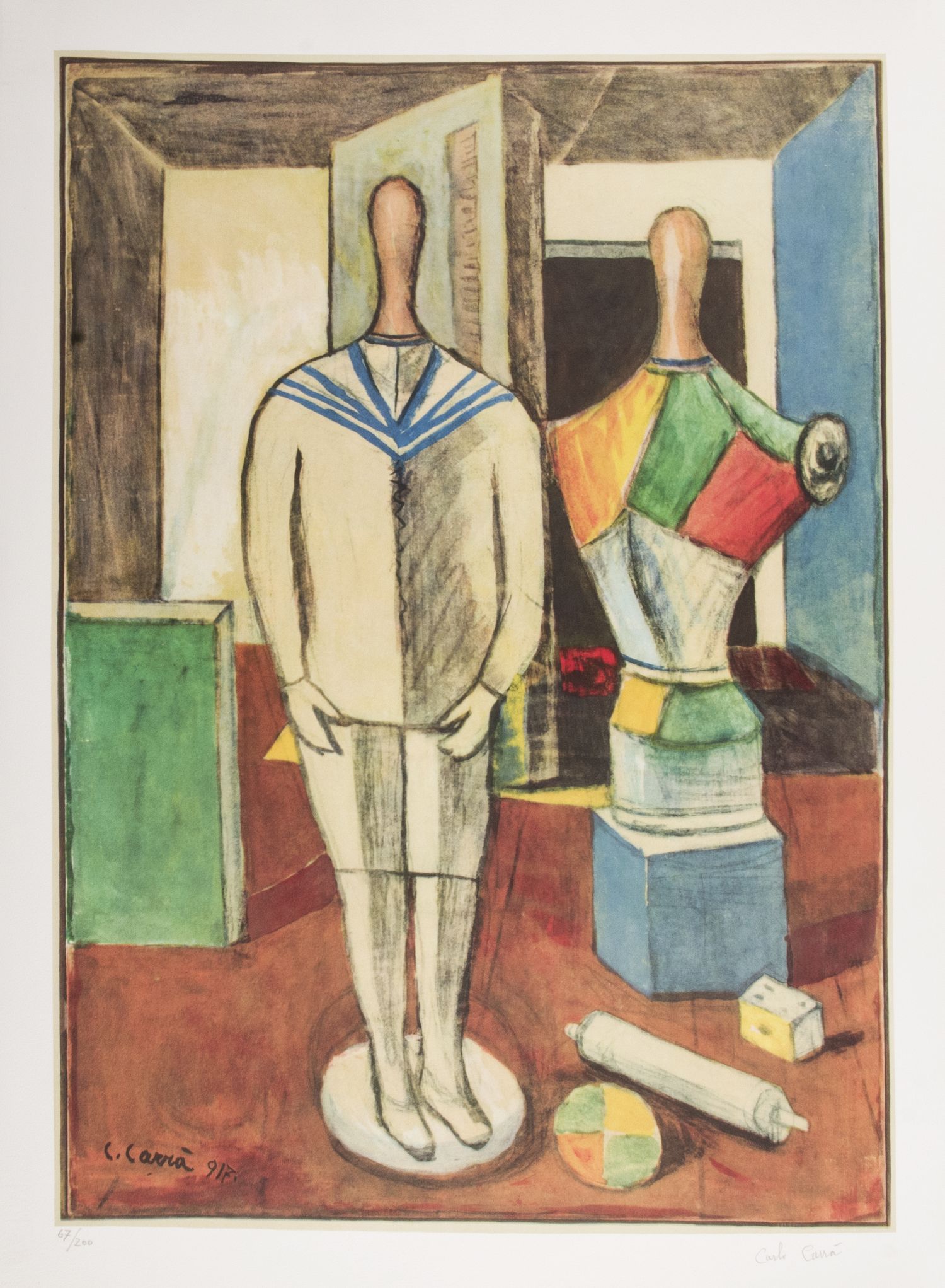 Carlo Carrà (1881-1966) Madre e figlio firma e data in lastra in basso a sinistra; firma in basso a destra; numerato 67/200 fotolitografia a colori eseguito nel 1952, Edizioni del Cavallino, Venezia cm 76,8x54,8 Bibliografia: Carrà, M. (a cura di), Carlo Carrà. Opera grafica 1922-1964. Neri Pozza Ed., Verona 1976, nota a p. 46