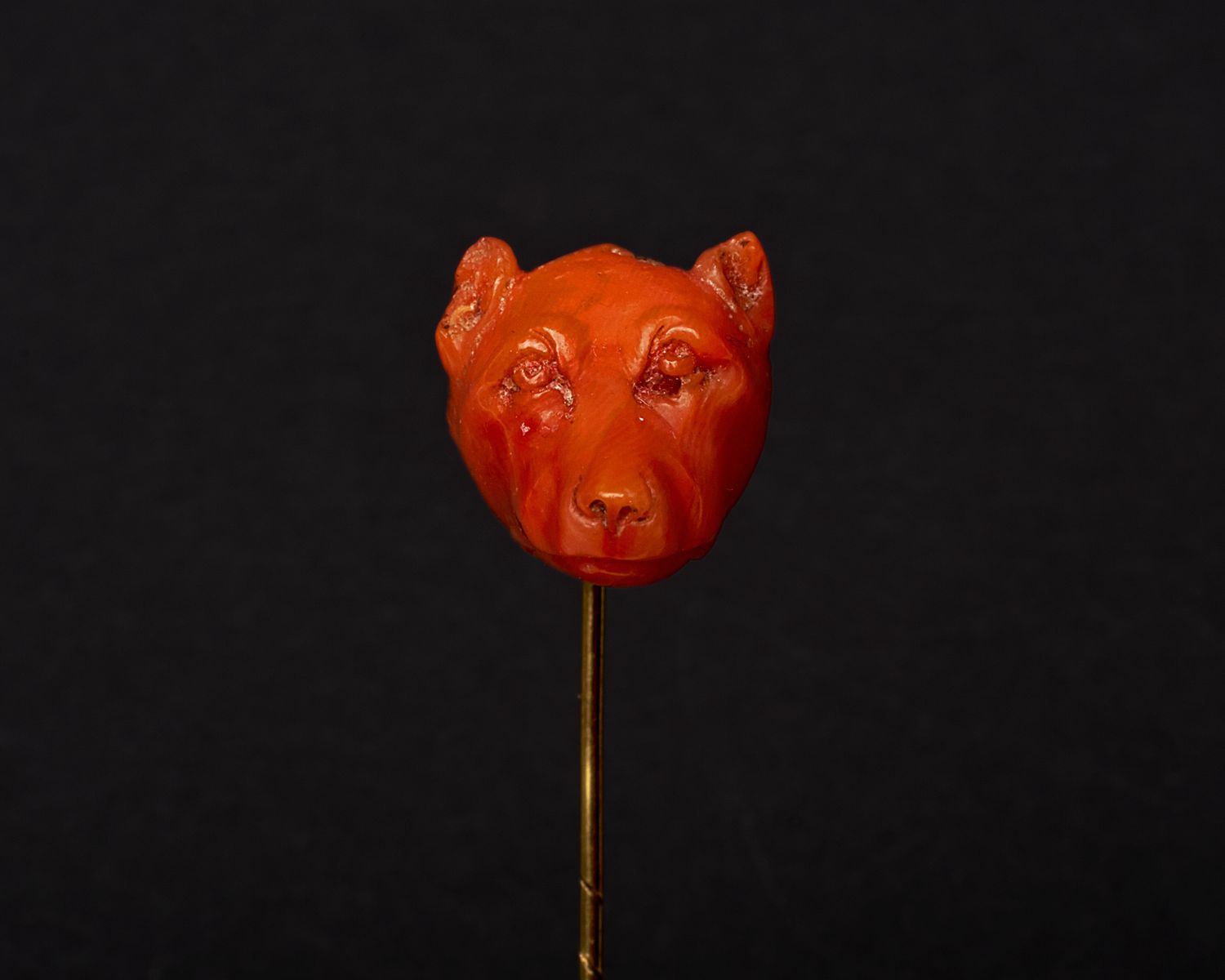 Spillone in oro giallo e corallo, corallo a forma di testa canina