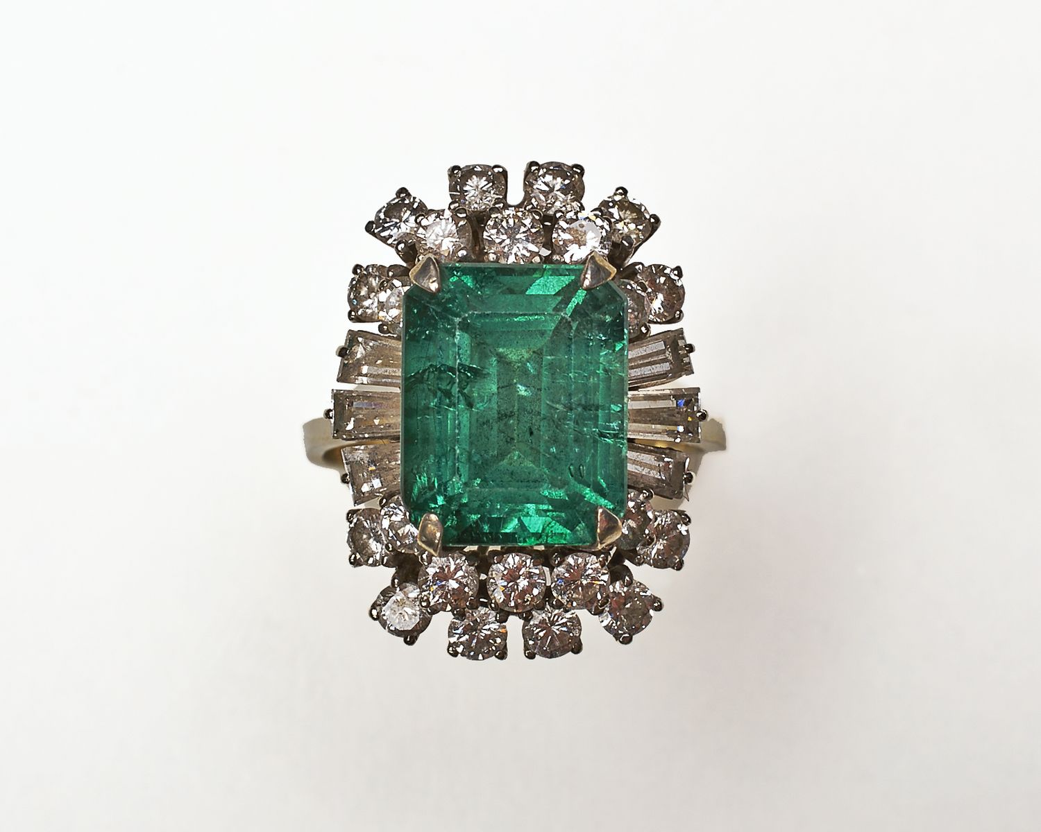 Anello in oro bianco, smeraldo e diamanti incastonato con smeraldo taglio...