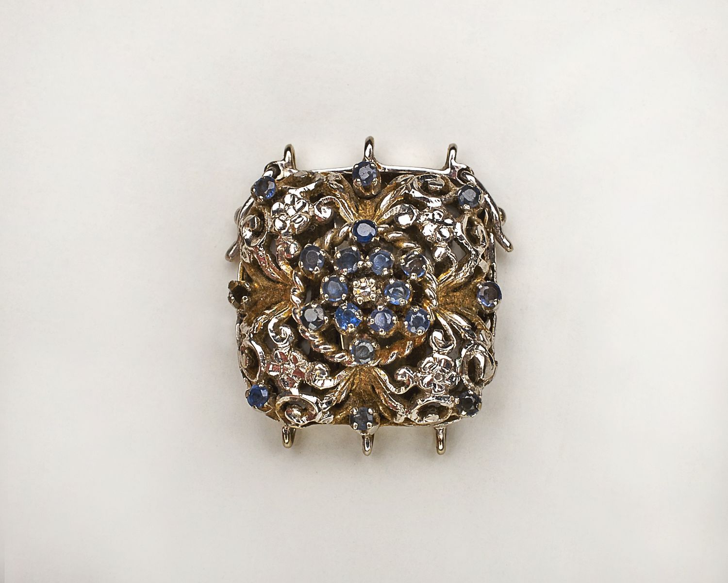 Fermezza in oro bianco e zaffiri forma quadrata con motivo floreale decorato...