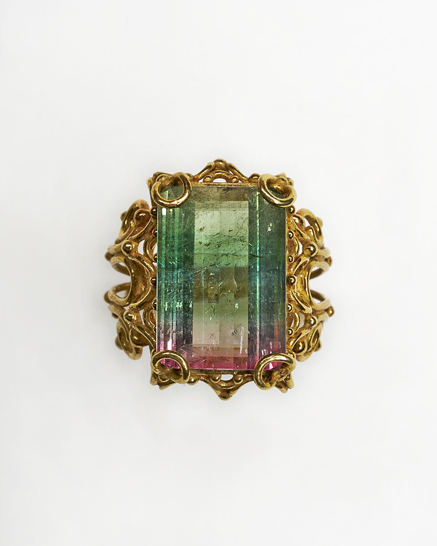 Anello in oro giallo e tormalina policroma tormalina cts 11,37 punzone 750 g 7,93 misura 17,5 certificato gemmologico L. Arcadi DD 03/09/2007