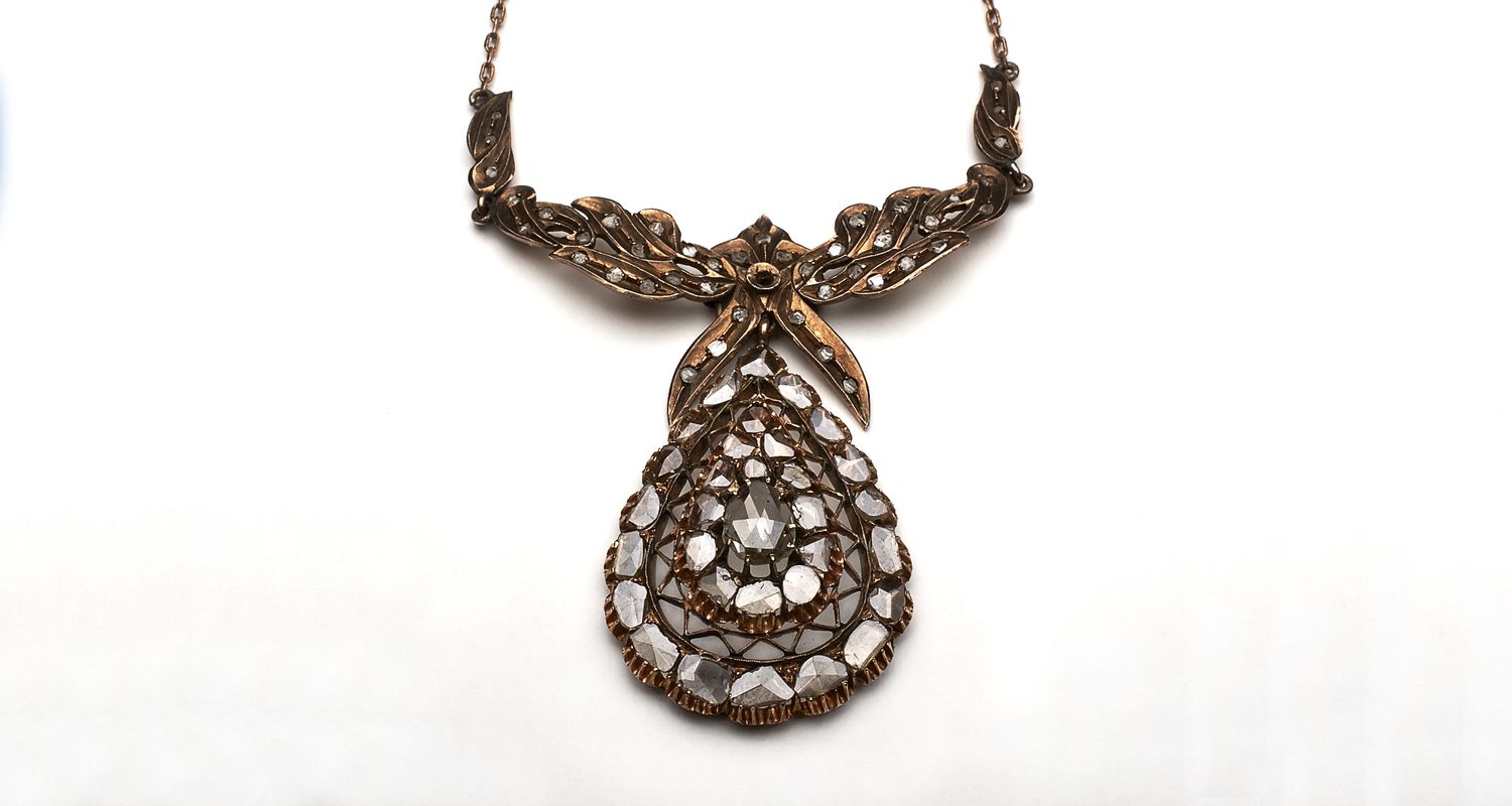 Lotto 162 | Collana in oro rosso e rosette di diamanti pendente centrale mobile a goccia...