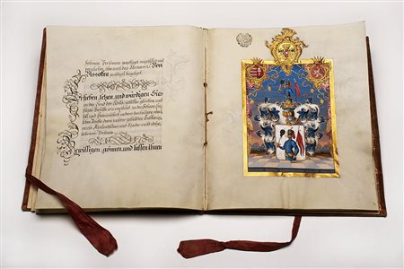 Patente nobiliare in pergamena conferita dall’Imperatore Leopoldo II di Ungheria e Austria a Samuel Trapp manoscritto miniato su pergamena in folio in elegante gotica tedesca entro bordura alle armi dell’Imperatore austro-ungarico, con grande miniatura a colori e oro raffigurante lo stemma della famiglia, legatura in velluto rosso con tracce di bindelle in seta composto da 14 pagine (usure alla legatura) Per confronto a un Diploma coevo rilasciato dal medesimo regnante a Giovanni Battista Lampi, cfr. in Mazzocca, F.-Pancheri, R.-Casagrande, A., Un ritrattista nell’Europa delle corti. Giovanni Battista Lampi (1751-1830), Trento 2001, p. 97