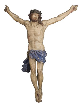 Scuola Italia Settentrionale Figura di Cristo crocifisso in legno intagliato e dipinto in policromia, inizi secolo XVIII fornito di gancio per sospensione (mancanze alle dita e privo di croce)